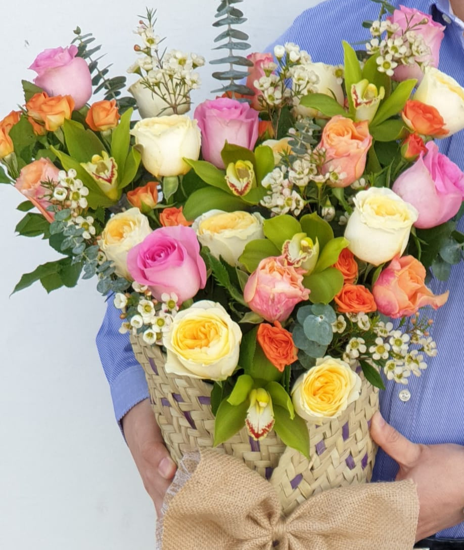A charming, vibrant bouquet that brings together shades of pink, white, yellow, and orange roses, beautifully arranged in a handmade natural wicker basket and adorned with a burlap bow for a rustic, elegant touch. A unique design that radiates joy and adds a warm, natural feel to any occasion — perfect for gifting or home decoration.