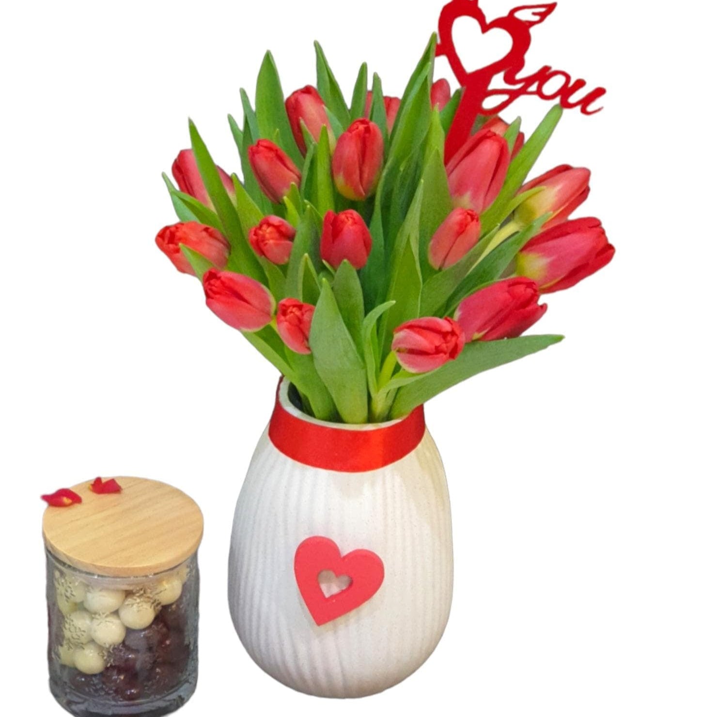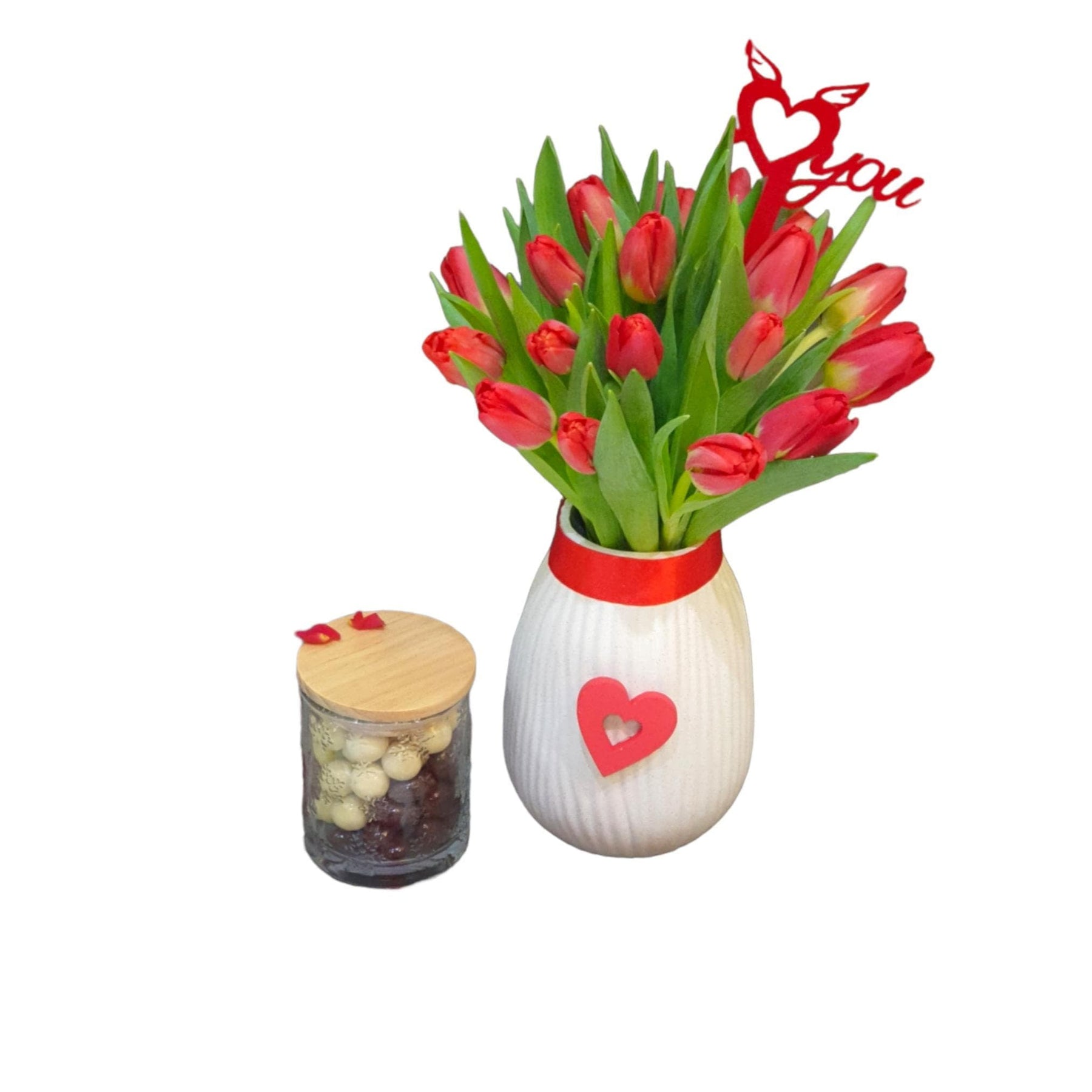 A embodiment of luxury and sophistication, this box combines high-quality chocolates with an elegant vase filled with red tulips, symbolizing love and beauty. Its refined design adds a touch of exquisite taste, making it a perfect gift for special occasions, expressing appreciation and beauty in a classy and luxurious manner.