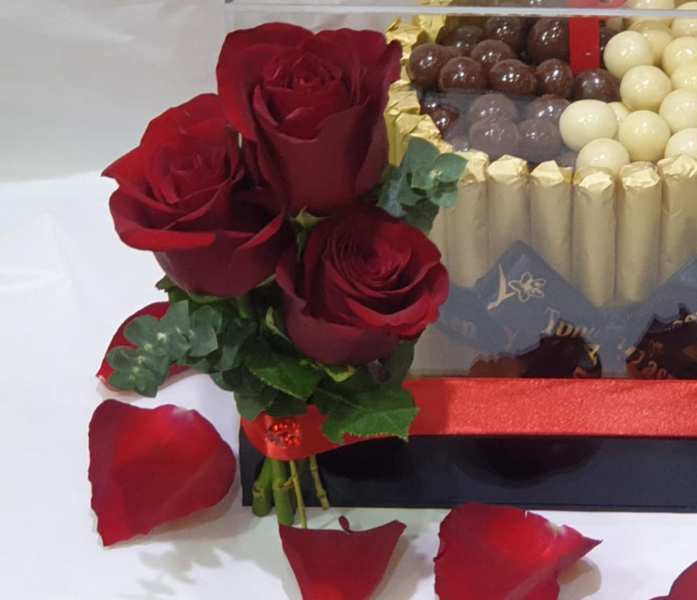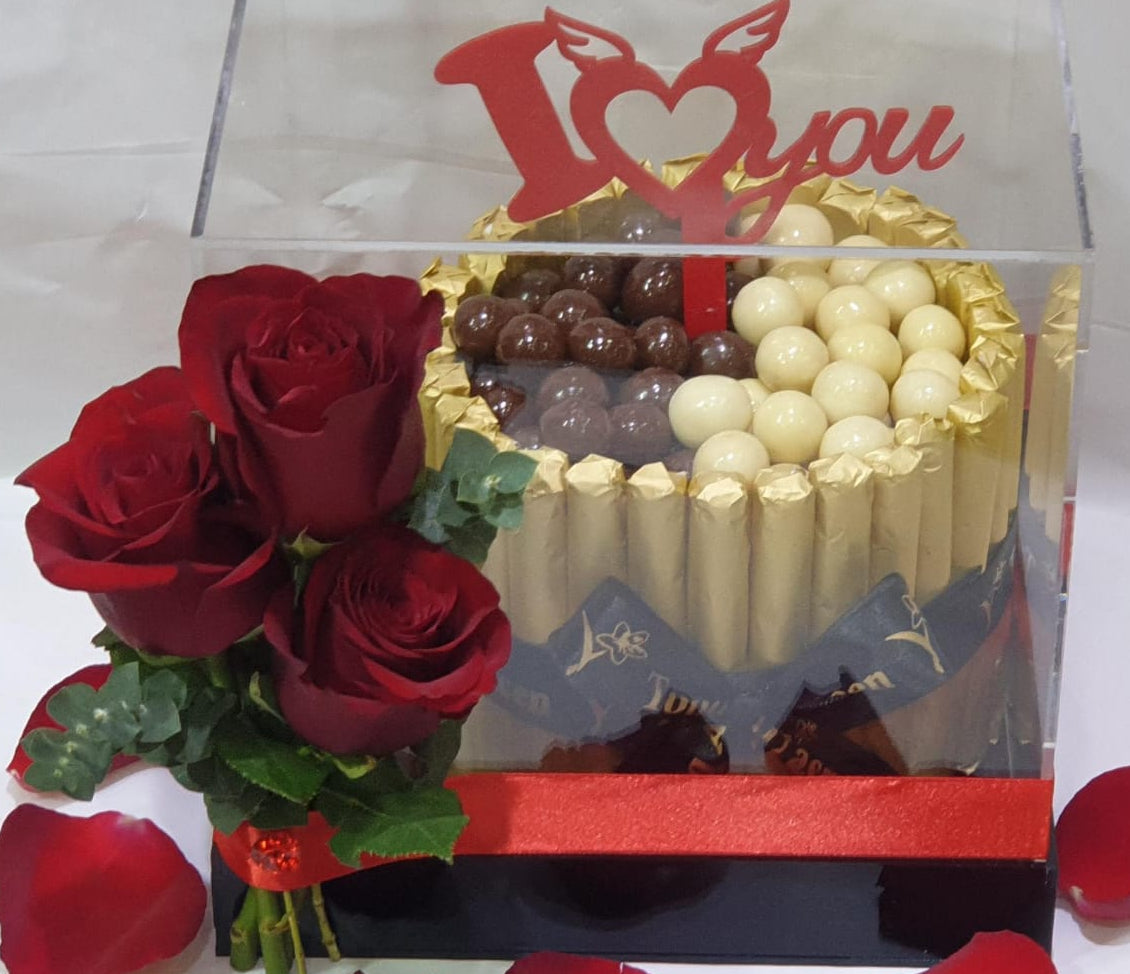 A sleek transparent acrylic box filled with a luxurious assortment of chocolates, beautifully adorned on the outside with vibrant red flowers. The perfect gift to express love and care on any special occasion.
