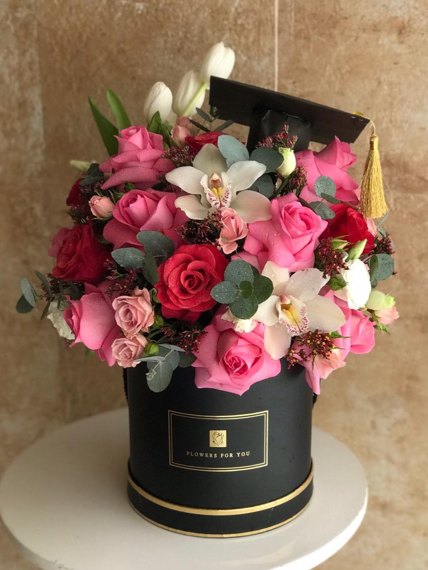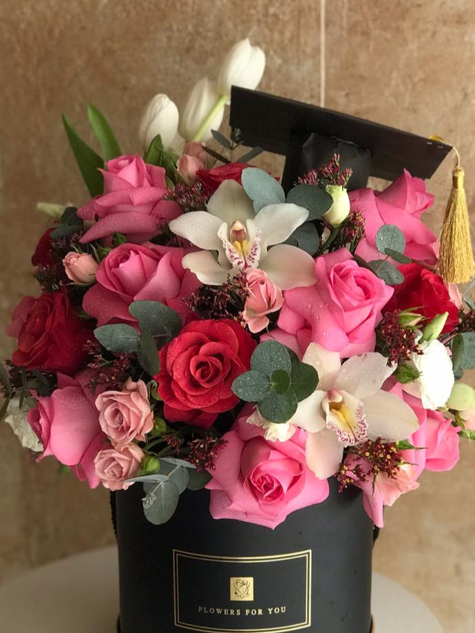 A stunning selection of carefully chosen flowers that combine elegance and natural beauty. It features pink and red roses, accented with white orchids and soft green leaves, creating an artistic tableau of love and uniqueness. Presented in an elegant black box with gold accents, it expresses feelings of joy, love, and appreciation in a refined and distinctive way. Perfect for special occasions or as a heartfelt gift conveying deep and genuine emotions