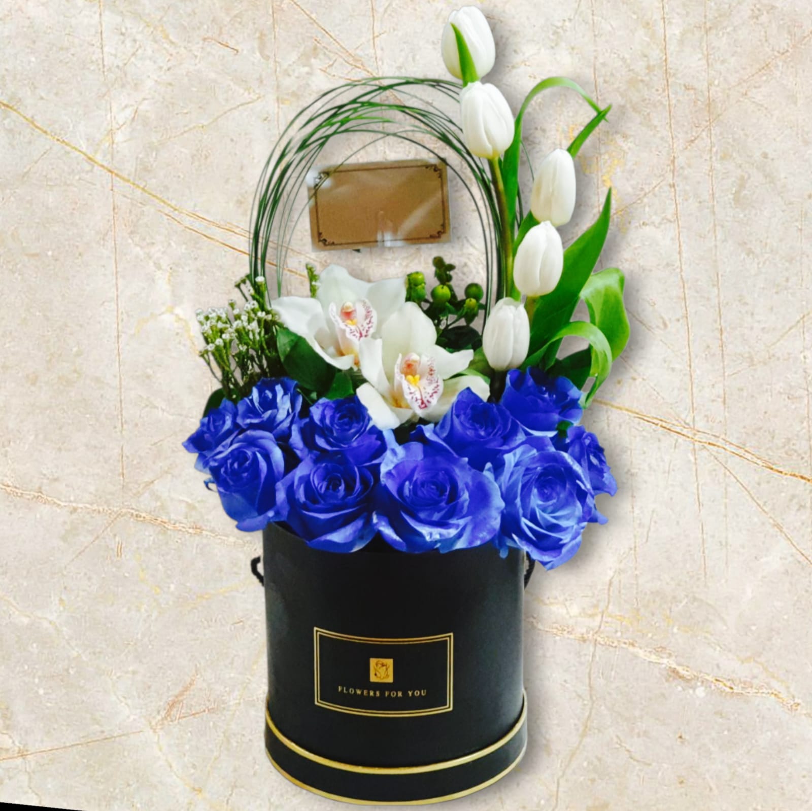 ✨ Enjoy a unique beauty with our luxurious bouquet "The Enchanting Blue Elegance". A blend of the finest white orchids and stunning blue foliage, arranged inside an elegant black box with a touch of gold, adding a touch of luxury.