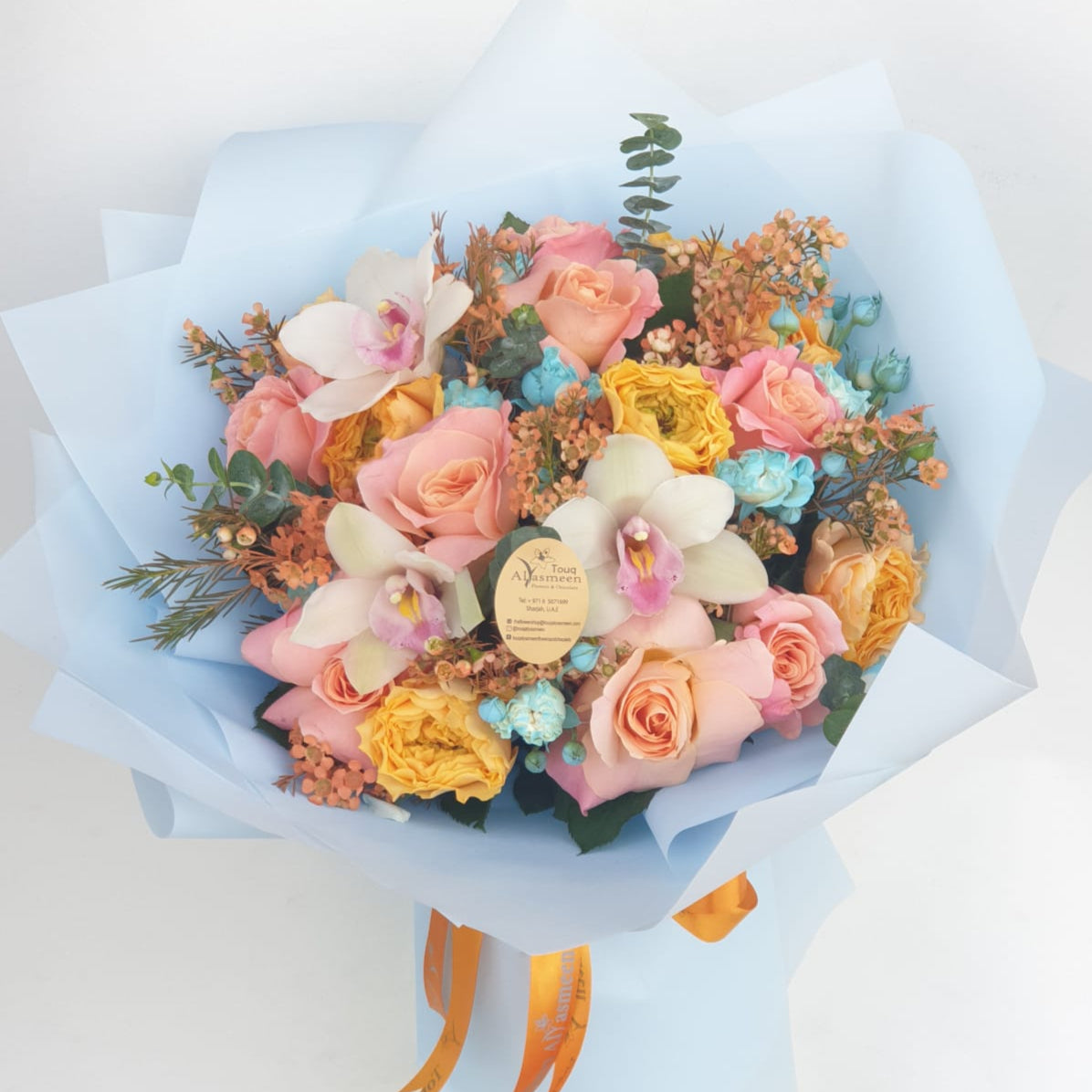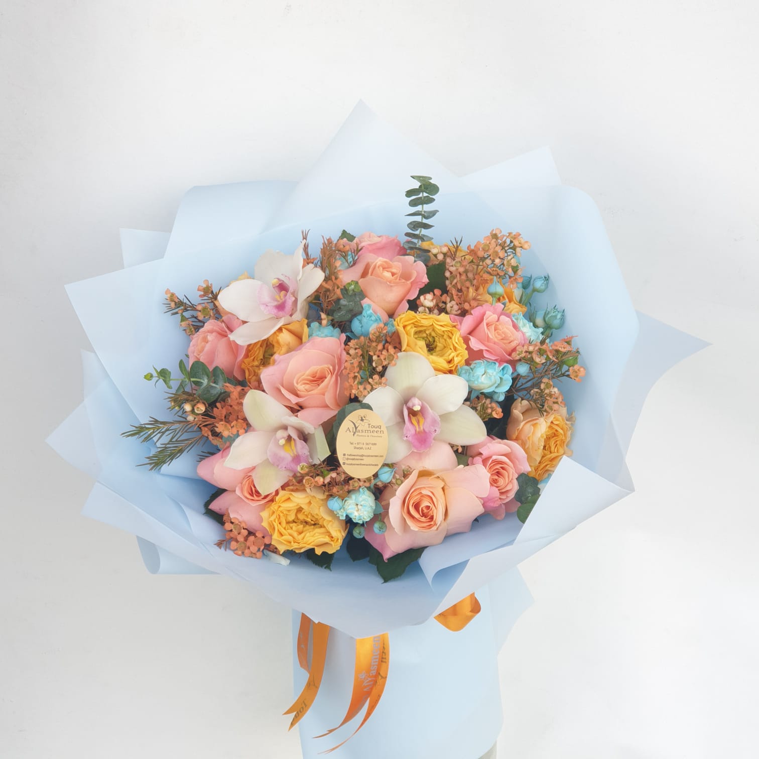 A luxurious flower bouquet that combines vibrant colors and elegant design. It features a special selection of pink, yellow, and white roses, accented with green leaves and small colorful flowers. Perfect for expressing love, appreciation, or adding a touch of beauty to any special occasion. It comes beautifully wrapped with lovely ribbons, making it an ideal gift for anyone who loves nature and elegance.